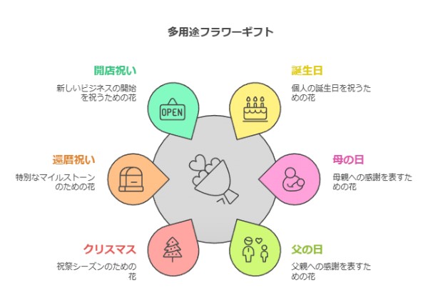 さらに、用途が広いのも魅力。誕生日プレゼントはもちろん、母の日や父の日、クリスマス、還暦祝いみたいな個人向けギフトから、開店祝いやライブイベント用のスタンド花まで対応してるんです。